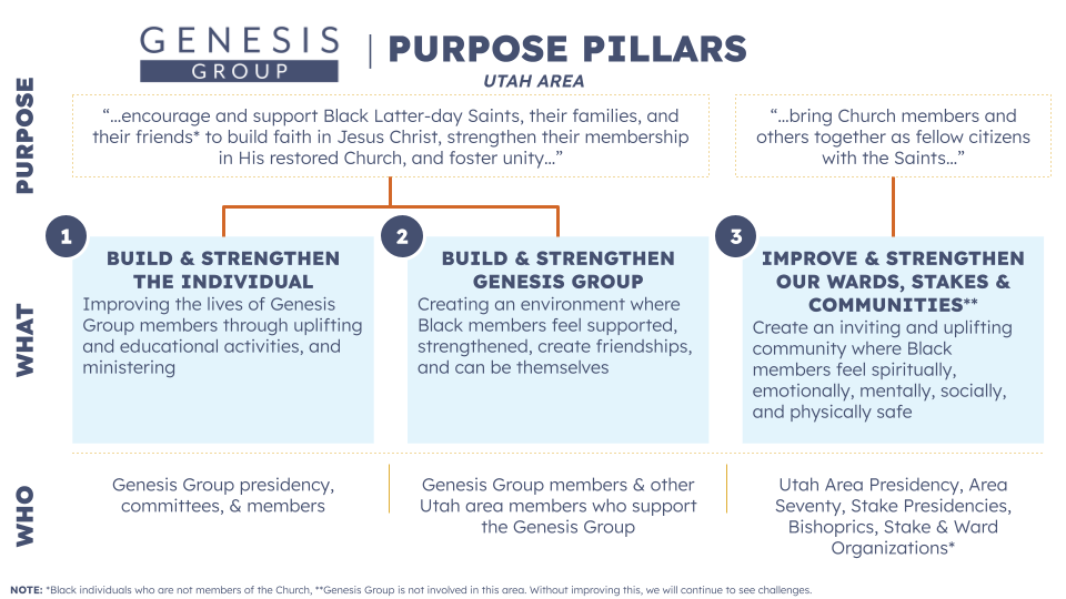 Our purpose is to encourage and support Black Latter-day Saints, their families, and friends in building faith in Jesus Christ, strengthening their membership in His restored Church, and fostering unity. Each pillar highlights a specific focus: strengthening individuals through uplifting activities and ministering; building a supportive Genesis Group community where members feel seen and valued; and improving our wards, stakes, and neighborhoods to ensure Black members feel spiritually, emotionally, mentally, socially, and physically safe. Together, these pillars reflect our commitment to belonging, discipleship, and growth.